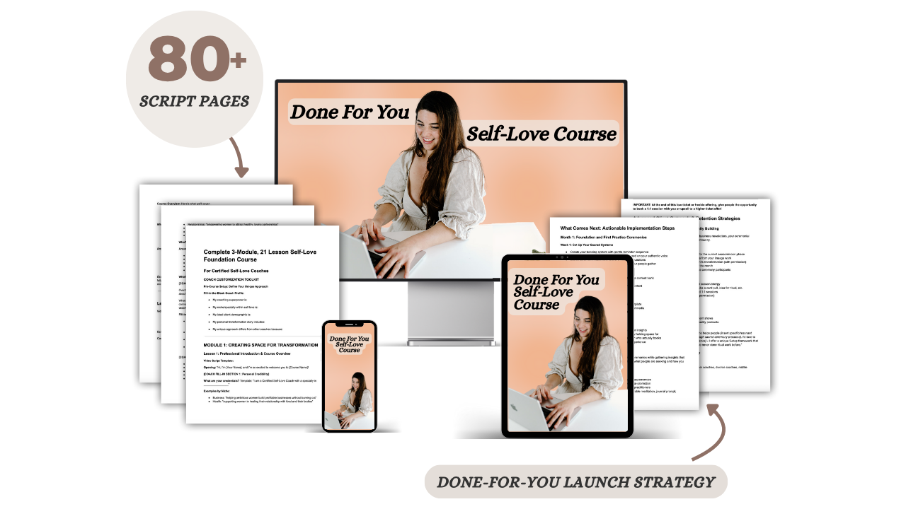 Skip months of content creation and launch your profitable self-love course in as little as 30 days with done-for-you scripts, recording tutorials, and proven marketing strategies.